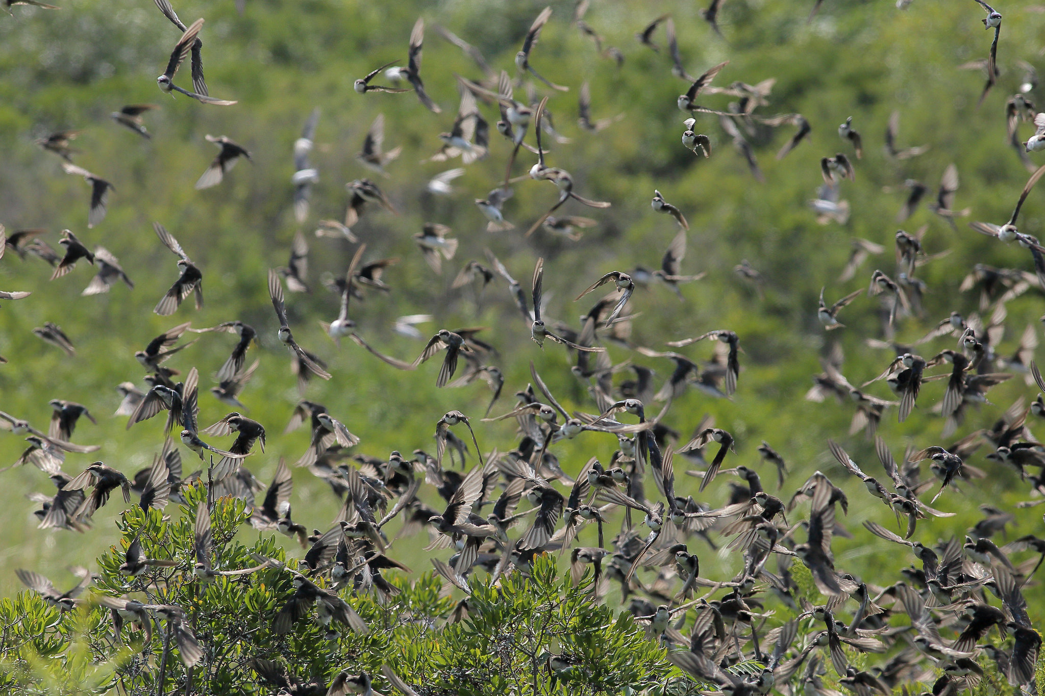 This photo, captured in Rye, New Hampshire, illustrates Tree Swallow “migration mania” that takes place in late summer. Hundreds of swallows pass through heading south and stop at points along the way. This photo was selected to be used in an issue of New Hampshire Audubon’s Afield publication.